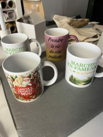 Mugs, textiles et accessoires sont personnalisés à l’aide de techniques durables telles que la sublimation, le flocage ou l’impression DTF, afin de garantir un rendu soigné et une excellente tenue dans le temps.